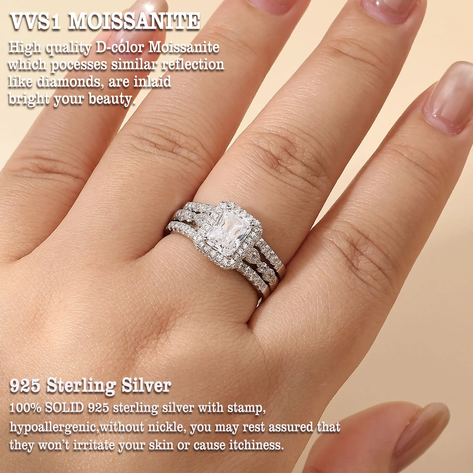- Main Stone: 3.0 Carat Radiant Cut Moissanite (D Color, VVS1 Clarity)